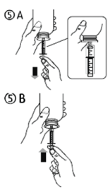 Fill the syringe with a small amount of solution by pulling the piston down (figure 5A), then push the piston upward in order to remove any possible bubbles (figure 5B). Pull the piston down to the graduation mark corresponding to the quantity in millilitres (ml) prescribed by your doctor (figure 5C).