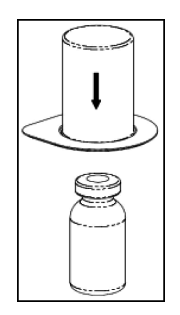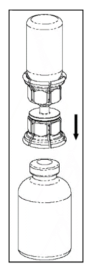 - Place the product vial on an even and firm surface. Invert the diluent vial with the Mix2Vial™ set attached and push the transparent adapter straight down through the product vial stopper. The diluent will automatically flow into the product vial.