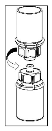 - With one hand hold the product side of the Mix2Vial™ set, hold the diluent side with the other hand and unscrew the set into two pieces. Discard the diluent vial with the blue part attached.