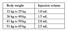 The required injection volume in mL should be drawn up in an empty 3 mL graduated syringe (see table below).