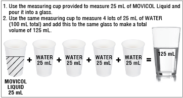 One dose is 25 mL of MOVICOL Liquid diluted with 100 mL of water, to make a total volume of 125 mL.
