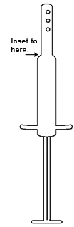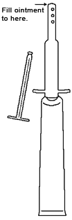 Step 2. Screw applicator onto tube, squeeze tube until ointment reaches last hole on the end of the nozzle (as indicated). Re-insert plunger, but do not depress yet. Wipe off excess from the nozzle.