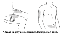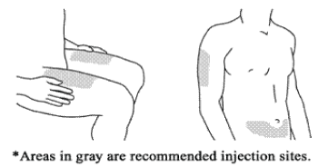 Good sites are the top of the thigh and around the tummy (abdomen) but about 5 centimetres away from the belly button (navel). Avoid, if possible, skin involved with psoriasis. If your caregiver is giving you the injection, they may use the upper arms or buttocks as well.